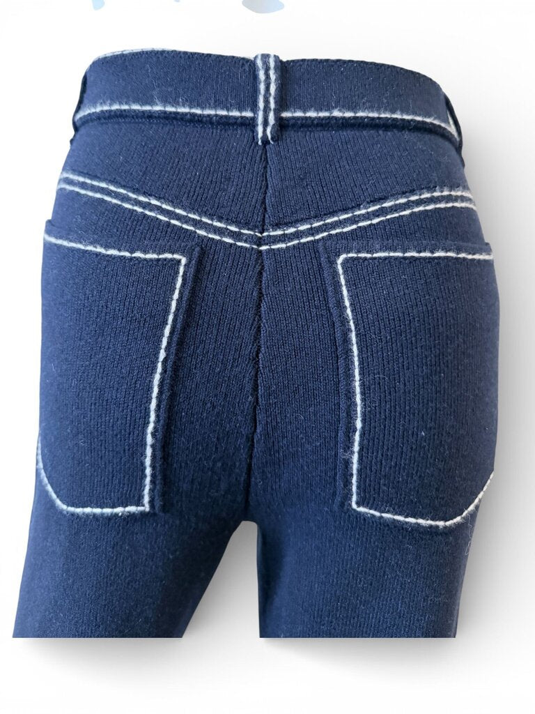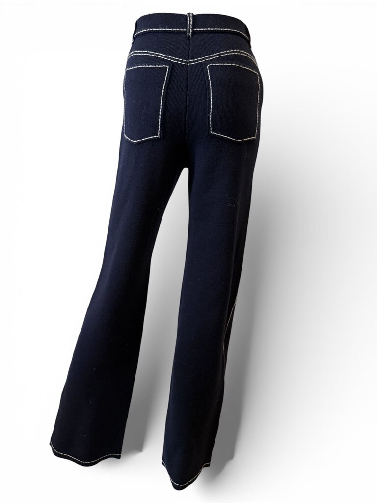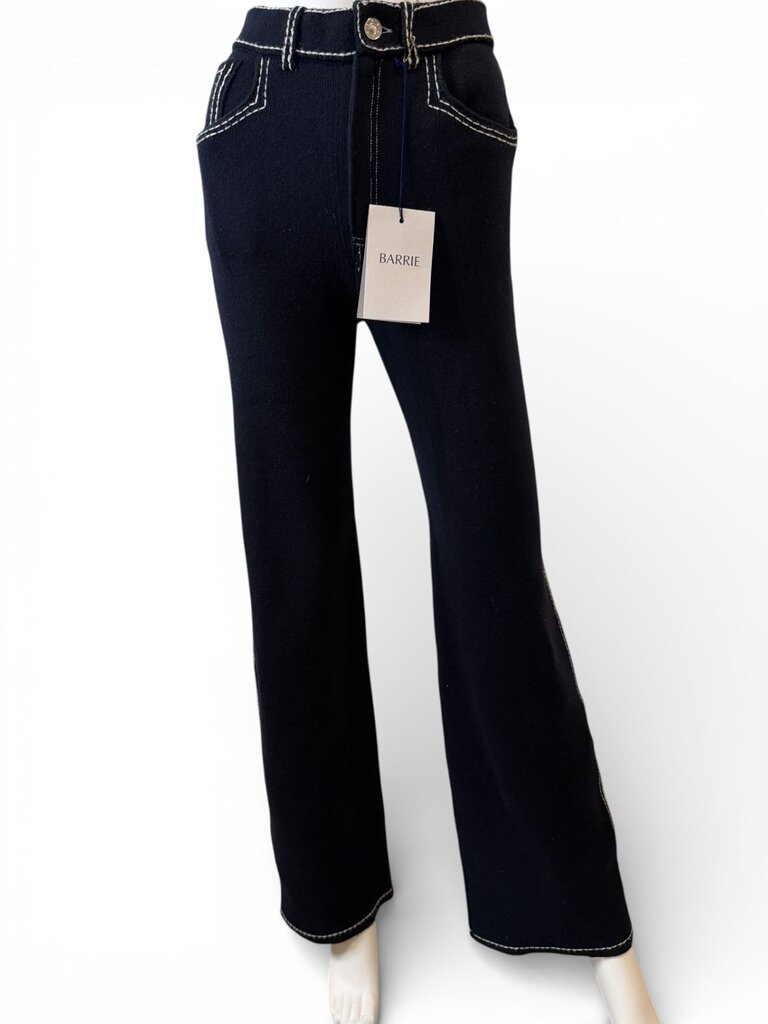 BARRIE is one of the oldest cashmere knitwear manufacturers in Scotland. In 2012, Barrie joined the prestigious circle of the Chanel Metiers d'Art houses. These high waisted denim trouser are a blend of finest cashmere and cotton. Flared cut and topstitching details on pockets and sides seams. NWT in pristine condition. Size Small. Estimated measurements are 26" waist, 32" inseam, 34-36" hip. These are knitwear so have stretch.