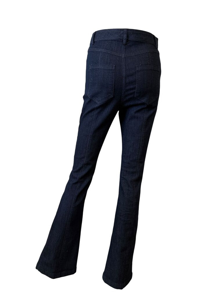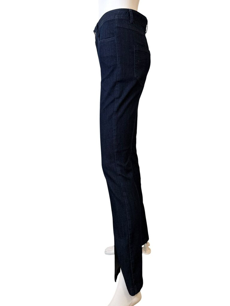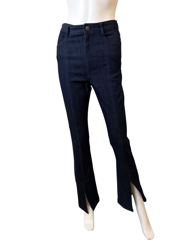CINQ A SEPT embodies the balance between sophistication and ease, daring and confident allure. These stylish women's dark wash jeans featuring a flared design with a split hem, perfect for a chic casual look. Excellent pre-owned condition with minimal signs of wear. Size 4. Approximate measurements: Waist 28", Rise 10" and Inseam 32"